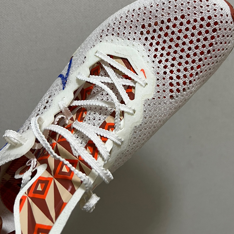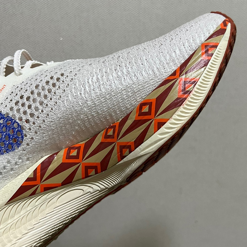 신발의 앞꿈치가 들려있어서 뛸 때 발이 쏠리면서 앞으로 나아갑니다. 속도를 더 낼 수 있는 신발입니다.